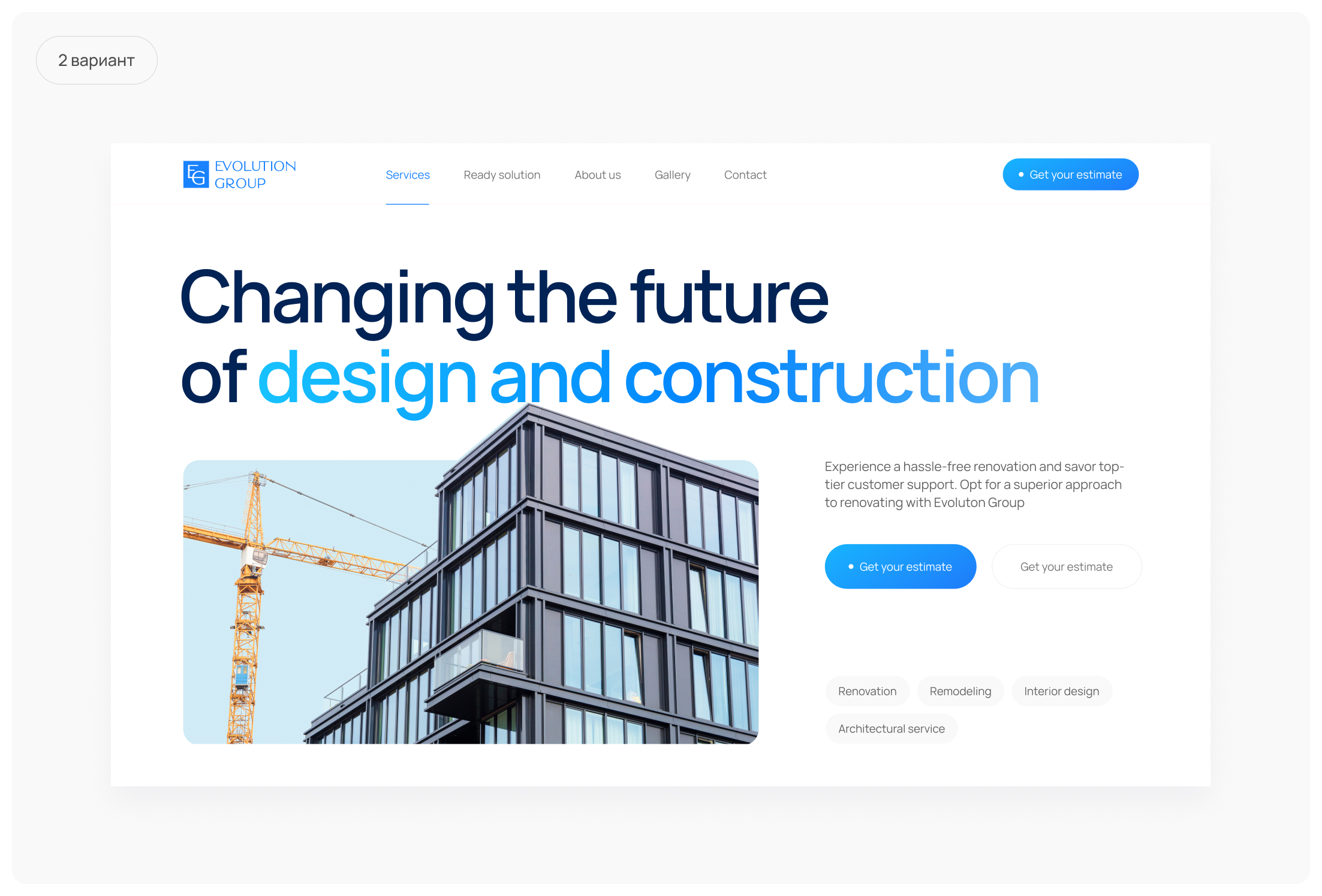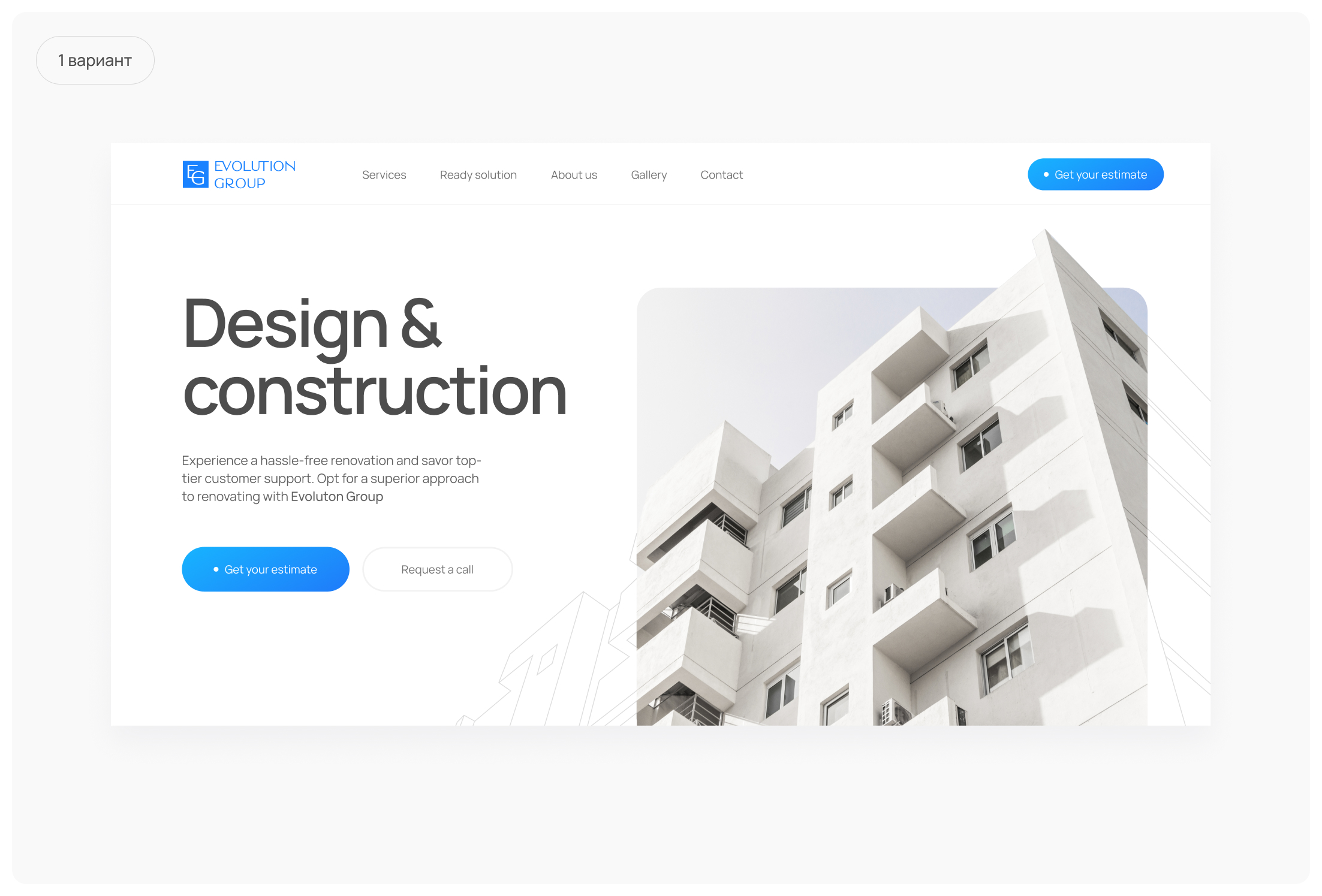 Дизайн страницы вдохновлен интерьерами компании Evolution Group: геометричные, минималистичные с максимально точной и конкретной маркетинговой коммуникацией, которая доносит ключевую информацию до пользователя через текстовые и графические элементы сайта.
