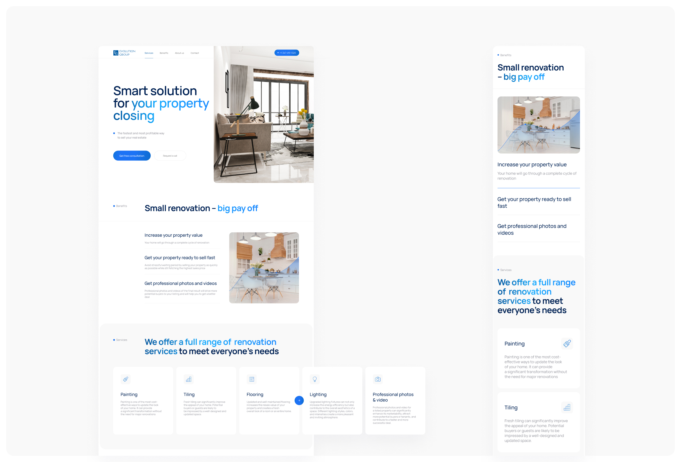 Evolution Group – американская компания, которая оказывает комплекс услуг по оперативному ремонту и реновации квартир с их дальнейшей продажей. Компания буквально за 2-3 недели осуществляет качественный ремонт, в результате которого квартира получает современный и приятный дизайн интерьера, что в итоге повышает привлекательность и стоимость продаваемого объекта недвижимости. Проект разработан совместно с TMG Agency.