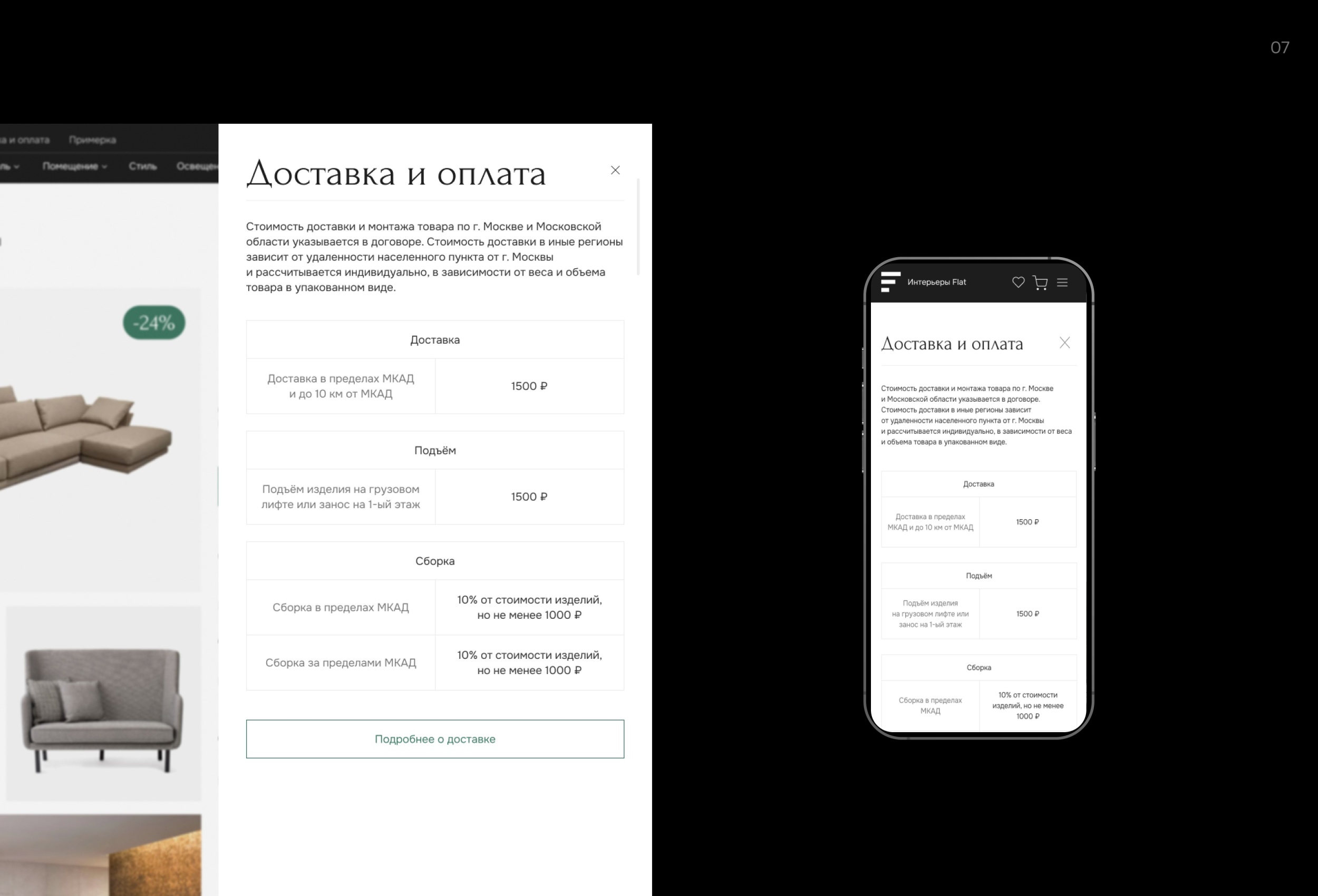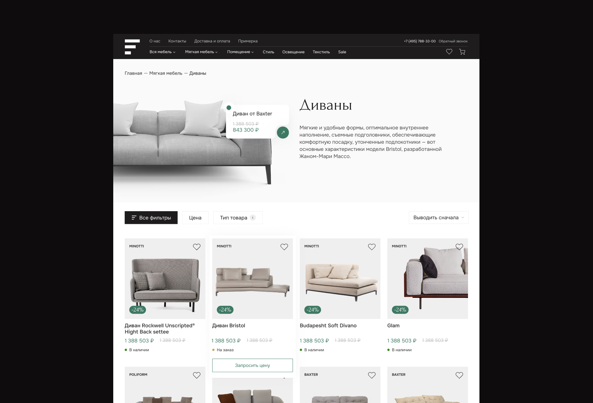 Также нами была добавлена навигация в виде «чипсов», которые предлагают пользователям похожие товары из категории в которой он находится, представленные в виде подкатегорий по стилям и материалам.