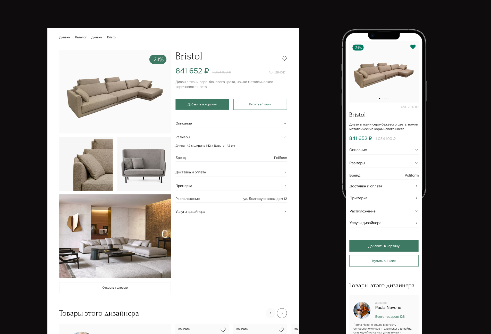 После изучения информации о товаре пользователь может изучить информацию по дизайнеру, который создал эту мебель, перейти на страницу этого дизайнера и посмотреть с какими брендами он работал и какая из созданных им мебель есть в наличии на сайте FLAT Интерьеры.