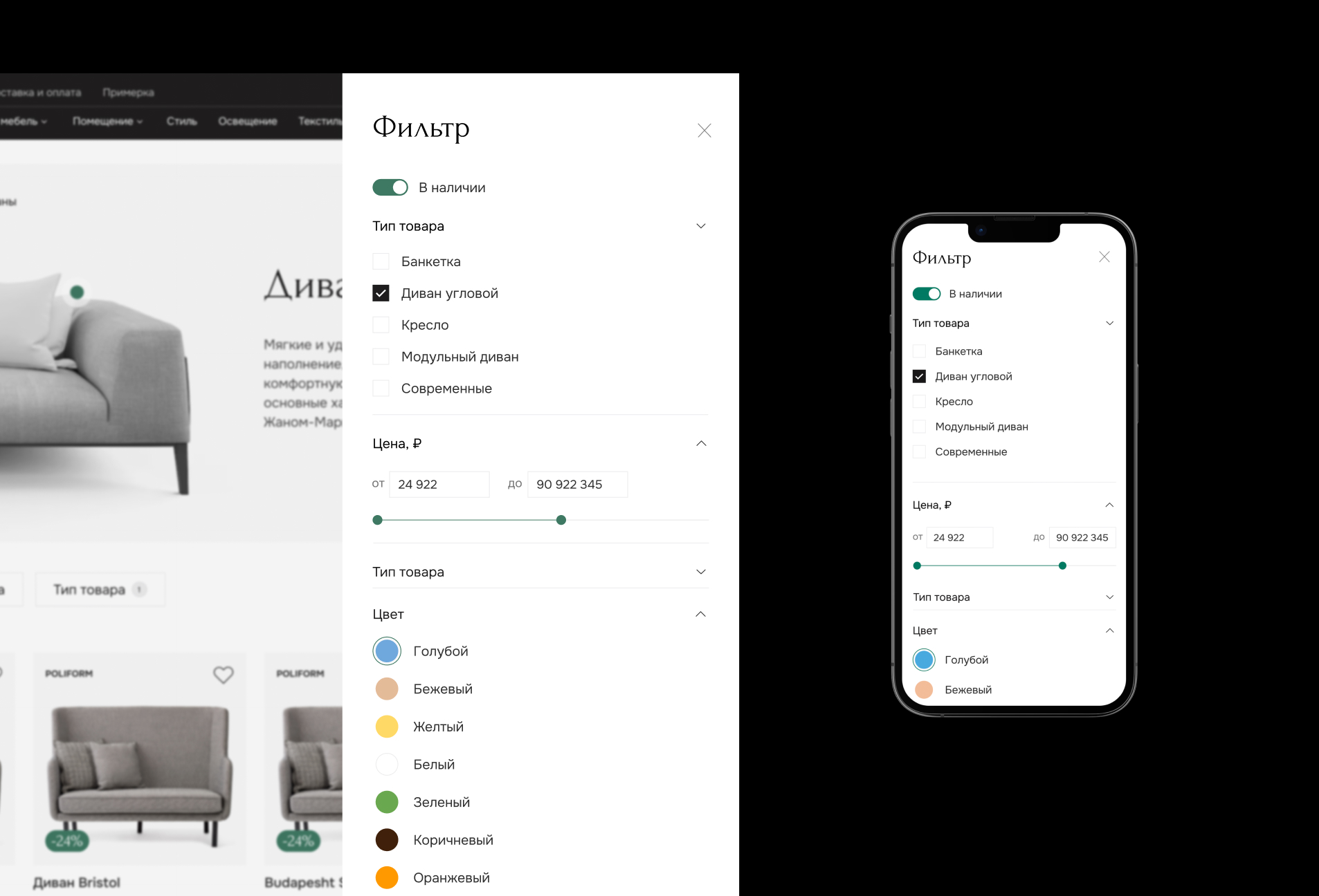 Фильтр представлен отдельным модальным окном, где можно осуществлять гибкую настройку поиска: по бренду, цвету, подкатегории товара, дизайнеру, материалу из которого сделан предмет, а также стилям.