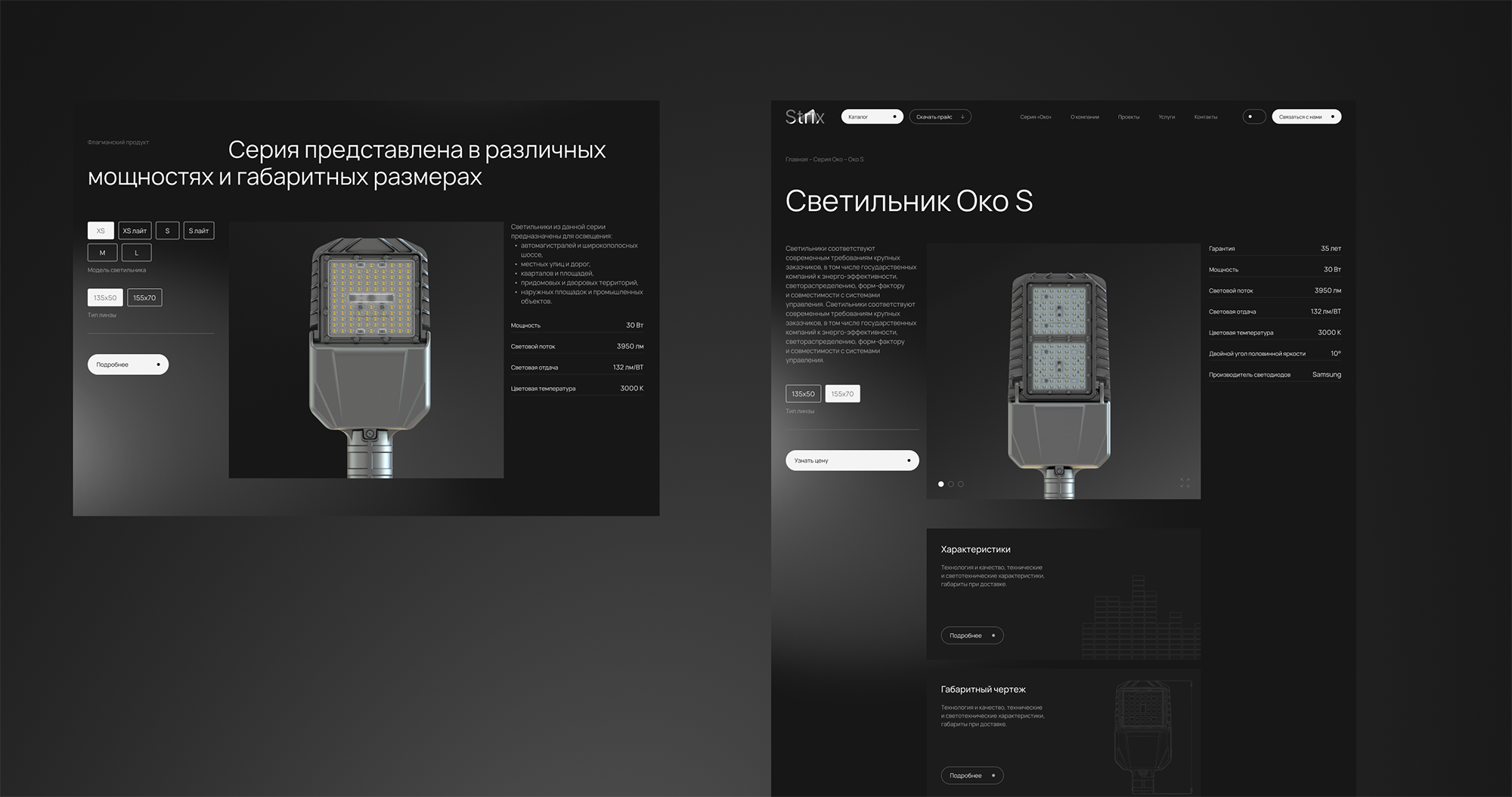 Страница разделена на три блока, где центральный элемент в виде красивого рендера товара всегда остается закрепленным при скролле. В левой части находится краткое описание и возможность выбора разных моделей в рамках одной линейки продуктов, а крайняя правая часть экрана содержит информацию с характеристиками.